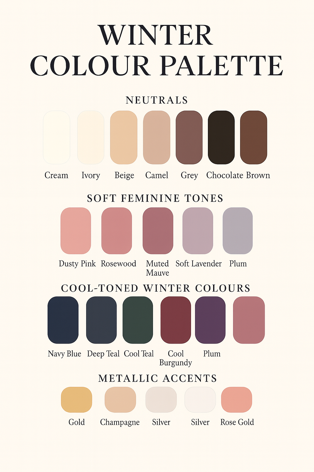 Of course, any colour can be winter-ready. The key is choosing shades that feel warm, elegant, and harmonious. Take some time to curate your own winter palette with the help of these colours below: